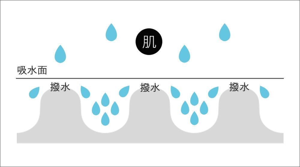 凹部の吸水加工が瞬時に液体を吸水し、凸部の撥水加工が表面をサラサラに保ちます。水分の“返り”による肌面の冷えも防ぐ体温低下防止効果もあります。
